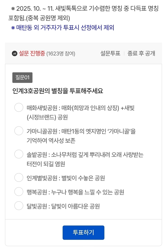 한편, 이번 ‘인계3호공원’ 별칭 투표는 오는 3월 13일까지 수원시 홈페이지 ‘새빛톡톡’을 통해 진행된다.