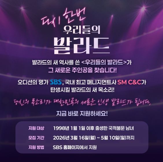 오디션 프로그램의 명가 SBS와 국내 최고 매니지먼트사 SM C&C가 손잡고 다시 한 번 발라드 열풍을 일으킬 ‘우리들의 발라드’는 올 하반기에 방송된다.