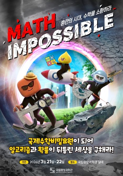 [와이뉴스] 과학기술정보통신부 국립중앙과학관은 3월 21일부터 22일까지 양일간, 관람객이 주인공이 되어 수학적 사고로 위기를 극복하는 임무형(미션형) 수학 행사 ‘Math Impossible: 혼란의 시대, 수학을 소환하라!’를 개최한다.