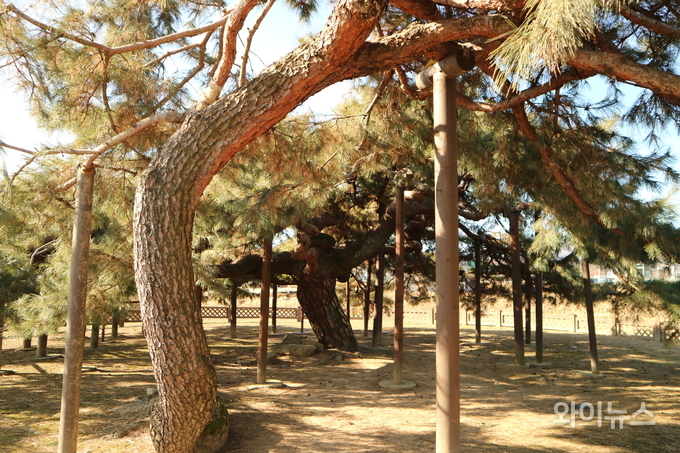 하늘을 향한 가지는 마치 용틀임하듯 기묘한 모습으로 비틀리면서 180도로 휘어진 모습을 하고 있다.
