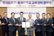 [와이뉴스] 경기도의회는 23일 오전 의장 접견실에서 동국대학교와 교육협력 및 학술교류를 위한 업무협약(MOU)을 체결했다. 이날 협약식에는 김진경 의장(더민주, 시흥3)과 고준호 의원(국민의힘·파주1), 김완규 의원(국민의힘·고양12), 이병숙 의원(더민주·수원12), 박호순 의정국장이 참석했다. 동국대학교에서는 윤재웅 총장, 김용현 교무부총장, 김승용 대학원장, 유한림 BMC(바이오메디캠퍼스) 행정처장 등이 함께 자리해 협약의 의의를 더했다. 양 기관은 이번 협약을 계기로 ▲의정 발전을 위한 정보 교류 ▲전문 인재 양성을 위한 교육·연구 지원 ▲도의원 및 의회 직원 대상 대학원 장학금 지원 등 의정 활동 역량 강화를 위한 체계적인 교육 협력에 나서기로 했다. 윤재웅 총장은 “대학의 교육·연구 역량을 공유함으로써 경기도 발전에 기여할 수 있게 되어 뜻깊다”며 “경기도의회와의 지속적인 협력을 통해 실효성 있는 교육 지원을 이어갈 수 있도록 최선을 다하겠다”라고 말했다. 김진경 의장은 “의회에 대한 도민의 기대는 점점 더 복잡해지고 다양화되고 있는 만큼 의회 구성원 모두가 더 많이 배우려