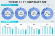 [와이뉴스] 국토교통부는 2025년 12월 기준 주택 통계를 공표했다. 2025년 12월 주택 인허가, 착공, 분양, 준공 실적은 12월 수도권 인허가는 82,077호로 전년동월(119,541호) 대비 31.3% 감소, 12월 누적 실적은 222,704호로 전년동기(234,083호) 대비 4.9% 감소했다. 서울 지역 12월 인허가는 2,576호로 전년동월(18,441호) 대비 86.0% 감소, 12월 누적 실적은 41,566호로 전년동기(51,452호) 대비 19.2% 감소했다. 비수도권 12월 인허가는 20,712호로 전년동월(39,904호) 대비 48.1% 감소, 12월 누적 실적은 157,130호로 전년동기(201,151호) 대비 21.9% 감소했다. 12월 수도권 착공은 40,344호로 전년동월(29,965호) 대비 34.6% 증가, 12월 누적 실적은 166,823호로 전년동기(163,255호) 대비 2.2% 증가했다. 서울 지역 12월 착공은 10,050호로 전년동월(3,620호) 대비 177.6% 증가, 12월 누적 실적은 32,119호로 전년동기(26,066호) 대비 2
