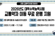 [와이뉴스] 시흥도시공사 교통약자이동지원센터는 2026학년도 대학수학능력시험을 앞두고 ‘수능 날 교통약자 차량 무료 지원 서비스’를 운영한다고 밝혔다. 접수 기간은 11월 3일부터 7일까지 5일간이며, 접수는 전화로만 가능하다. 지원 대상은 2026학년도 수능 응시생으로, 운행은 수험생 자택에서 시험 고사장까지 편도 무료로 제공된다. 당일 오전 이동에 한정해 안전한 이동 동선을 확보하고, 수험생의 시험 일정에 맞춰 신속한 운행을 지원할 예정이다. 이번 지원은 교통약자 수험생의 안전하고 원활한 시험 응시를 돕기 위한 특별 교통 지원 대책으로, 시흥시교통약자이동지원센터 등록 회원을 대상으로 진행된다. 센터는 시험 당일 차량과 운전인력을 별도로 배치하고, 운전원 응대 교육과 시험장 주변 교통 상황 사전 점검 등을 통해 세심한 이동 서비스를 제공할 계획이다. 유병욱 사장은 “수험생들이 이동 불편 없이 시험에 집중할 수 있도록 돕는 것이 이번 지원의 핵심”이라며, “앞으로도 교통약자들의 이동권 보장을 넘어 시민 누구나 차별 없이 이동할 수 있는 교통 환경 조성에 앞장서겠다”고 밝혔다.