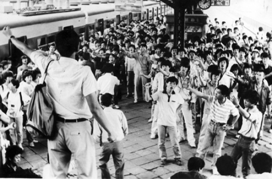 ▲ 1987년 민주항쟁 당시 수원역 구내에서 구호를 외치는 대학생들 모습이다.