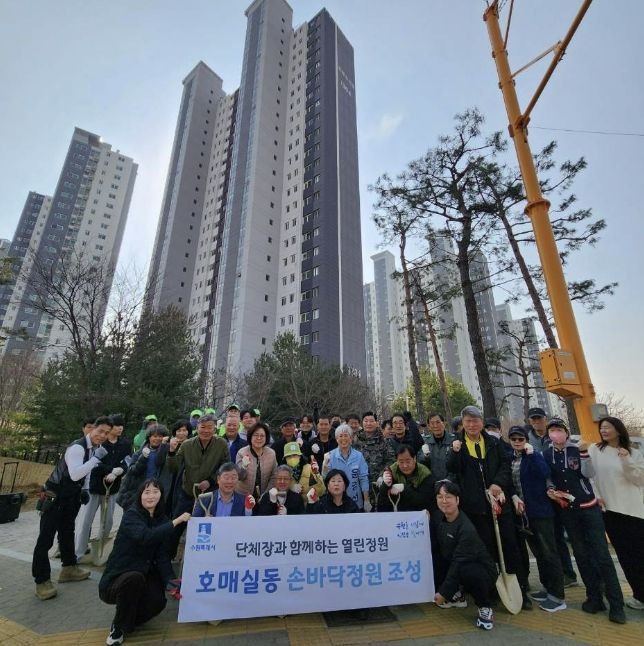 [와이뉴스] 지난 24일, 수원시 권선구 호매실동은 쾌적한 마을 환경 조성과 도심 속 정원 문화 확산을 위해 아파트 단지 인근 유휴지에 ‘손바닥 정원’을 조성했다.