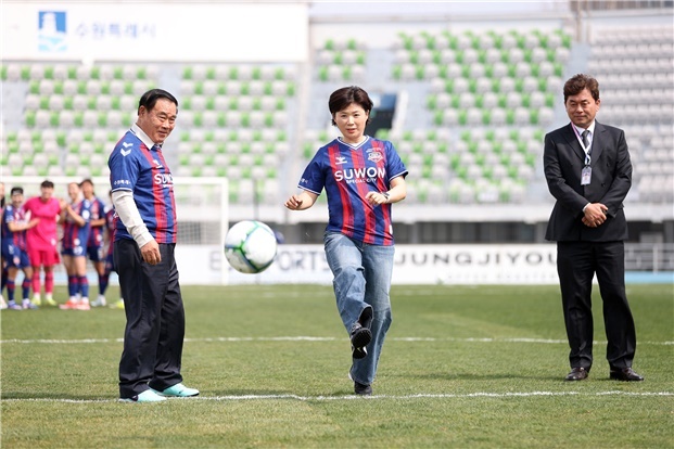 [와이뉴스] 수원특례시의회 문화체육교육위원회 장미영 위원장(더불어민주당, 광교1·2)이 앞선 4일 오후 수원종합운동장에서 열린 2026시즌 WK리그 홈 개막전에 참석해 시축하고 시즌 개막을 축하했다.