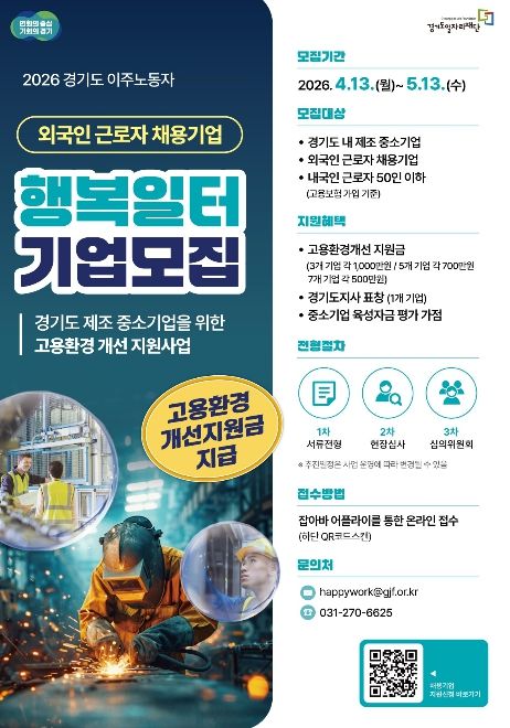 [와이뉴스] 경기도와 경기도일자리재단은 도내 외국인 근로자를 고용한 중소 제조기업을 대상으로 ‘2026년 경기도 이주노동자 행복일터 선정사업’ 참여기업을 모집한다고 20일 밝혔다.