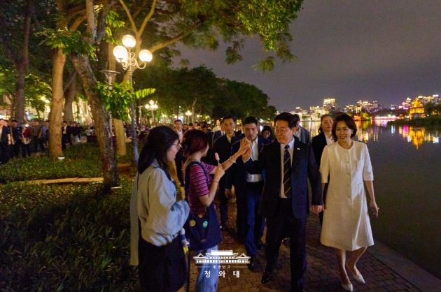 이어 이 대통령 부부는 인근 식당으로 자리를 옮겨 쌀국수와 볶음밥으로 저녁 식사를 함께했다. 이후 호안끼엠 호수 일대를 산책하며 베트남에서의 소중한 추억을 쌓았으며, 산책을 마친 뒤에는 베트남 국민들에게 다시 한번 손을 흔들어 인사를 전하며 일정을 마무리했다.