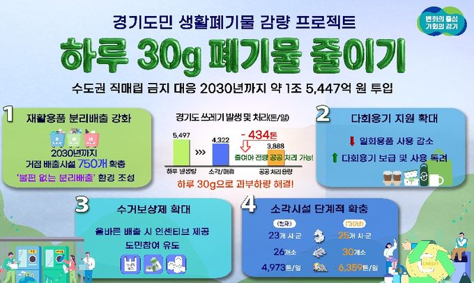 [와이뉴스] 수도권 직매립 금지에 따른 생활쓰레기 감량을 위해 경기도가 2030년까지 5년간 약 1조 5,447억 원을 투입하는 ‘하루 30g, 도민실천형 생활폐기물 감량 프로젝트’를 추진한다.