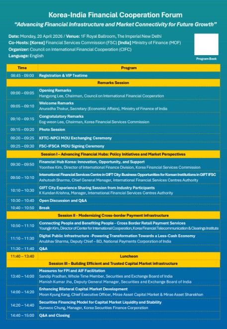 이 위원장은 4월 20일 뉴델리에서 최초로 개최된 한-인도 금융협력포럼(주최: 해외금융협력협의회, 후원: 금융위원회)에 참석했다. 이 위원장은 축사를 통해 “금융이 한국의 압축 성장을 이끈 것처럼, 금융이 인도의 새로운 도약을 위한 엔진이 될 것”이라며 양국간 금융협력의 중요성을 강조했다. 이번 포럼은 미래 성장을 위한 금융인프라 및 시장 연계성 강화(Advancing Financial Infrastructure and Market Connectivity for Future Growth)”라는 대주제 아래, ▲국경 간 결제 인프라 현대화, ▲자본시장 인프라 구축, ▲금융중심지 발전이라는 세 개의 세션으로 진행됐다.