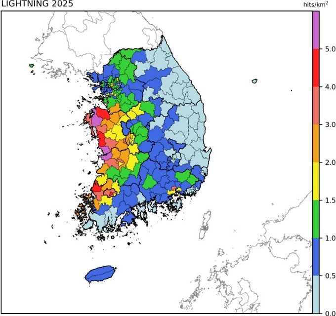 [와이뉴스] 기상청은 2025년 우리나라에서 관측된 낙뢰 정보를 담은 ‘2025 낙뢰연보’를 발간했다. 연보는 기상청 21개 낙뢰 관측망으로 관측한 자료를 통해 분석한 △월별, 광역시·도별, 시군구별 낙뢰 횟수 △단위 면적당(㎢) 횟수 △낙뢰 공간 분포 △주요 5대 낙뢰 사례 등의 내용을 담고 있다.