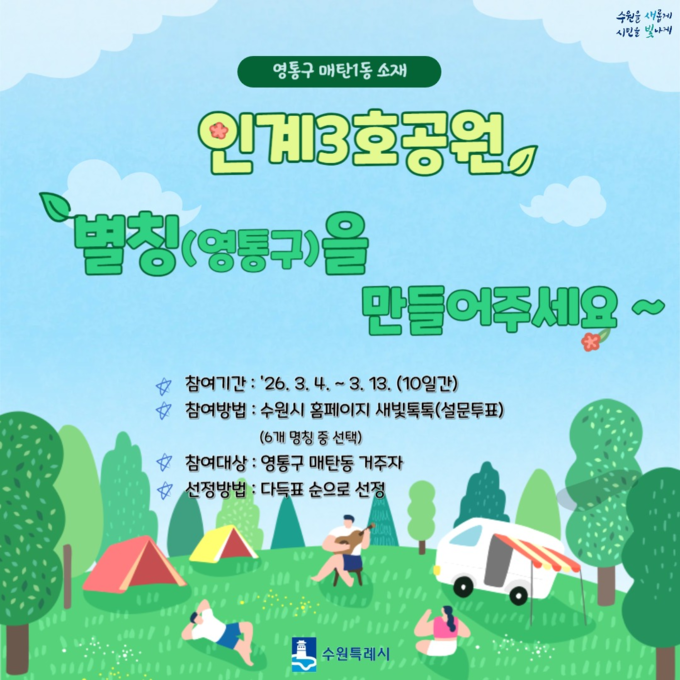 한편, 이번 ‘인계3호공원’ 별칭 투표는 오는 3월 13일까지 수원시 홈페이지 ‘새빛톡톡’을 통해 진행된다.