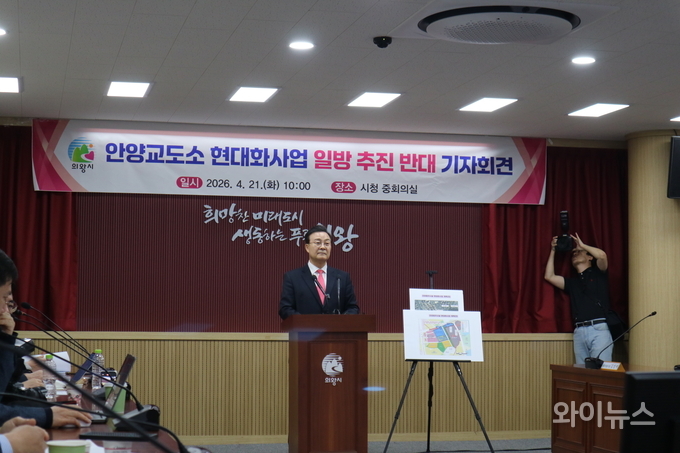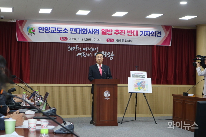 [와이뉴스] 김성제 의왕시장이 21일 오전 시청사 신관 2층 중회의실에서 기자회견을 열고 안양교도소 현대화 사업 추진 관련 입장문을 발표했다.