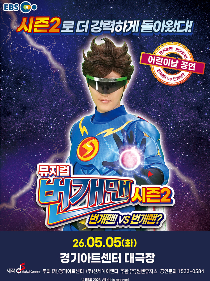어린이날 당일인 5월 5일에는 대극장에서 인기 캐릭터 공연 ‘뮤지컬 번개맨 시즌2’가 공연된다. 참여형 구성과 역동적인 무대로 어린이 관객의 몰입도를 높일 것으로 기대된다.